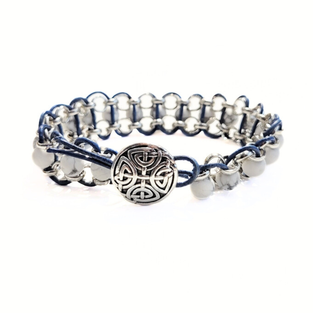 Discover serenity and ambition in one elegant piece of jewelry with our Tranquil Ambition Howlite Bracelet. Crafted with 6mm Howlite beads, a 6mm rolo link chain, and leather accents, this bracelet is more than just an accessory—it's a source of tranquility, clarity, and the motivation to pursue your spiritual and material goals. Immerse yourself in the calming and balancing properties of Howlite, and experience the journey towards patience and success.