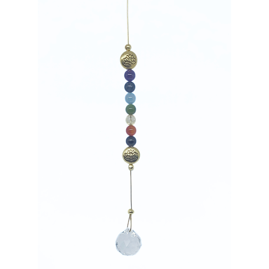 Elevate your space with our Chakra Gemstone Suncatcher, a stunning creation designed to bring harmony and vibrant energy into your life. Whether you choose to hang it in your window or from the rear-view mirror of your car, this suncatcher is made with semi-precious gemstone beads and elegant gold-plated lotus charms. The gemstones featured are Garnet, Carnelian, Citrine, Canadian Jade, Aquamarine, Iolite, and Amethyst, each representing one of the seven chakras. This suncatcher features a captivating 20mm prism that will refract light into a dazzling display of colors.